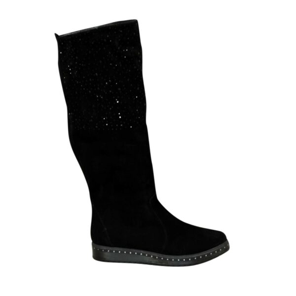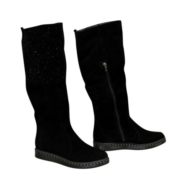 Жіночі чоботи труби із натуральної замші чорного кольору на суцільній потовщеній підошві. Декоровані камінням. Дуже зручні. Обсяг гомілки можна замовити від 35 см до 40 см для будь-якого розміру.