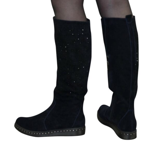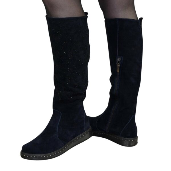 Жіночі чоботи труби із натуральної замші синього кольору. На суцільній потовщеній підошві. Дуже зручні. Обсяг гомілки можна замовити від 35 см до 40 см для будь-якого розміру.