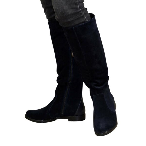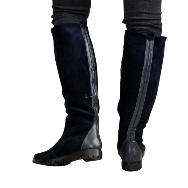 Жіночі чоботи труби з натуральної замші та шкіри синього кольору. На потовщеній підошві. Дуже зручні. Обсяг гомілки можна замовити від 35 см до 40 см для будь-якого розміру.