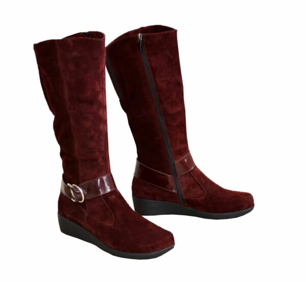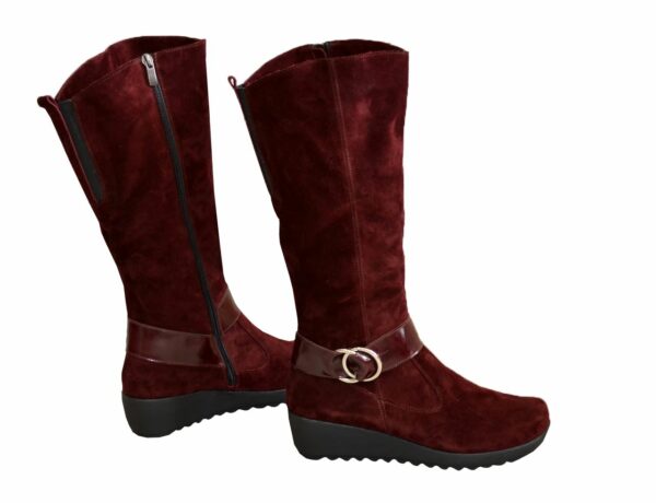 Зручні жіночі чоботи із натуральної замші бордового кольору на танкетці. Декоровані ремінцем із натуральної бордової шкіри. Об'єм гомілки можна замовити для будь-якого розміру.