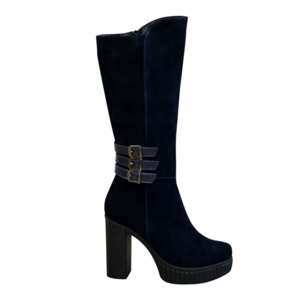 Класичні жіночі чоботи з натуральної замші синього кольору, декоровані шкіряними ремінцями на халяву є широка вшита гумка збоку чобота для додаткового об'єму гомілки, гарні зручні, практичні та стильні на високому стійкому підборі. Об'єм гомілки можна замовити для будь-якого розміру.