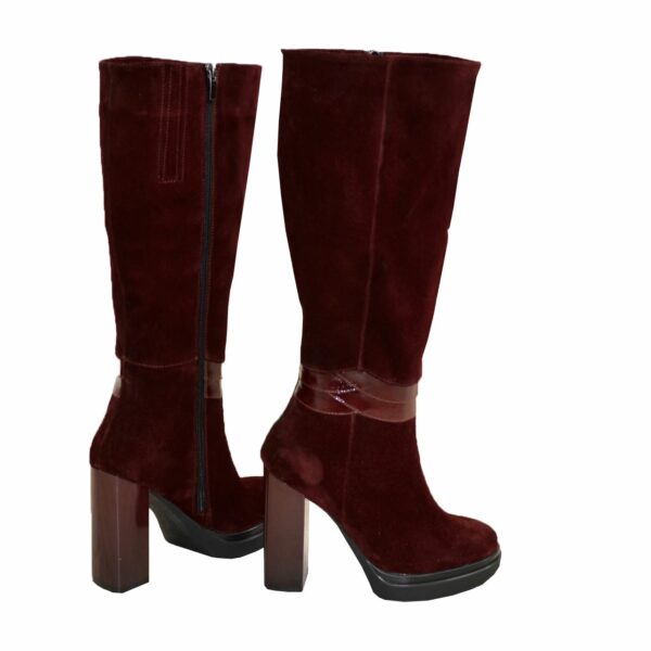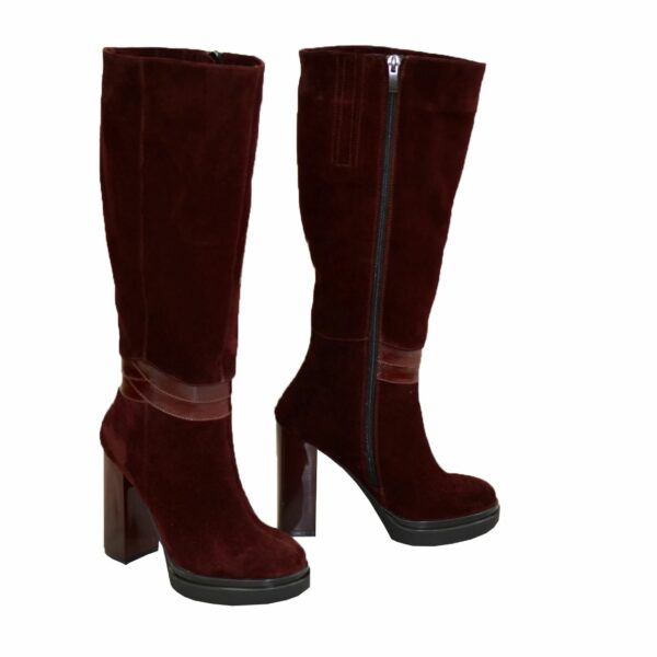 Класичні жіночі чоботи з натуральної замші бордового кольору, декоровані вставками з натуральної шкіри на халяву. Об'єм гомілки можна замовити для будь-якого розміру.