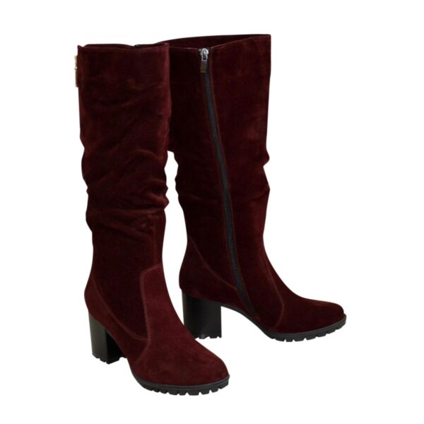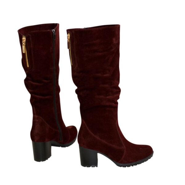 Стильні чоботи жіночі з натуральної замші бордового кольору, з гумкою у верхній частині чобота. На потовщеній підошві. Обсяг гомілки можна замовити від 35 см до 40 см для будь-якого розміру.
