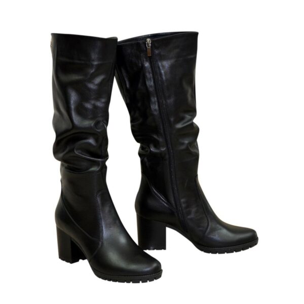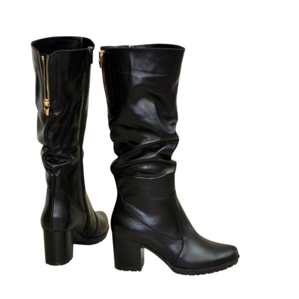 Стильні жіночі чоботи із натуральної шкіри чорного кольору, з гумкою у верхній частині чобота. На потовщеній підошві. Обсяг гомілки можна замовити від 35 см до 40 см для будь-якого розміру.