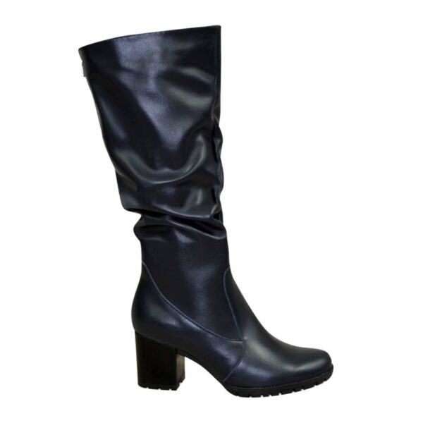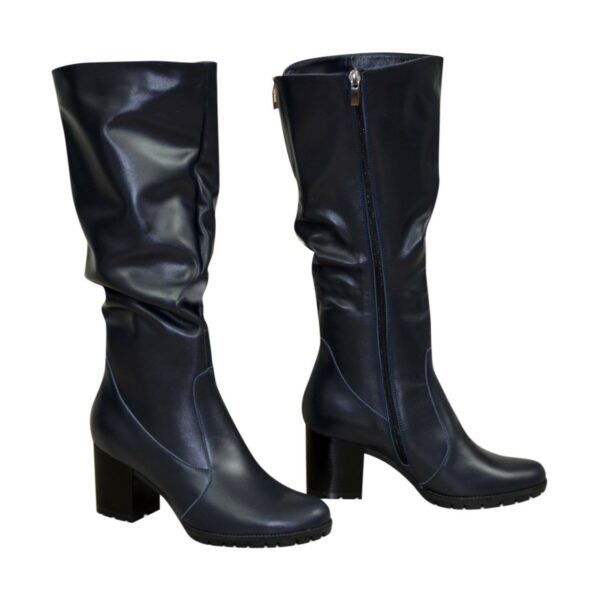 Стильні жіночі чоботи із натуральної шкіри синього кольору, з гумкою у верхній частині чобота. На потовщеній підошві. Обсяг гомілки можна замовити від 35 см до 40 см для будь-якого розміру.