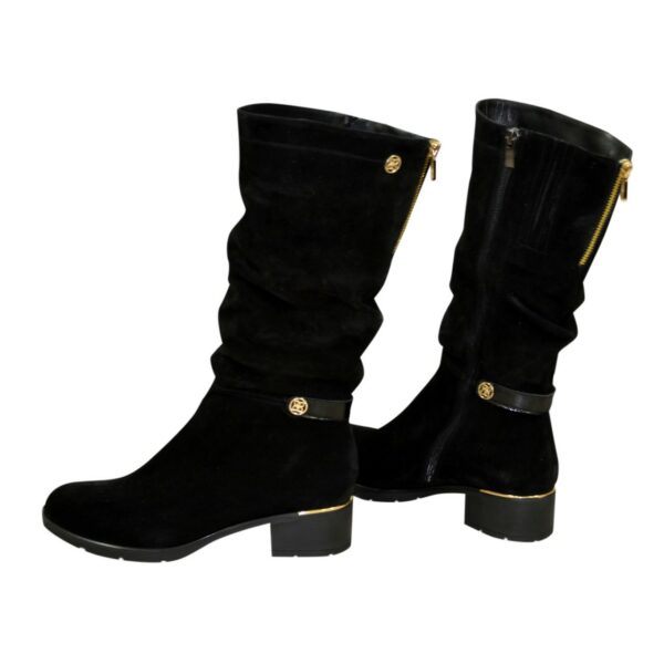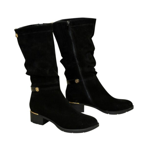 Стильні жіночі чоботи із натуральної замші чорного кольору, з гумкою у верхній частині чобота. На потовщеній підошві із стійким підбором. Обсяг гомілки можна замовити від 35 см до 40 см для будь-якого розміру.