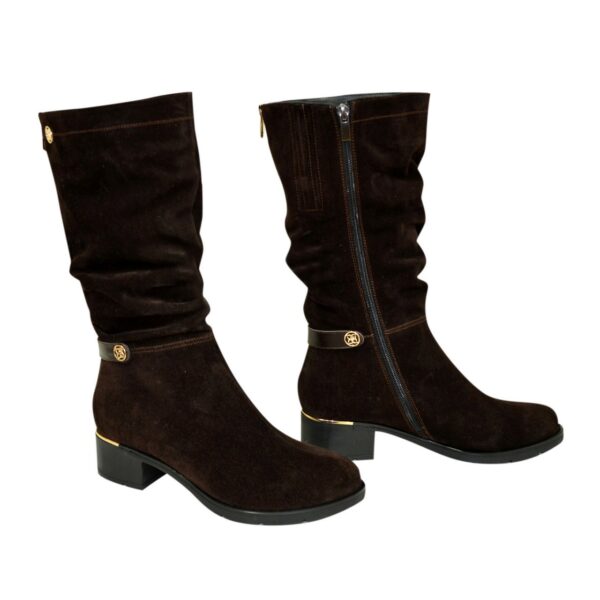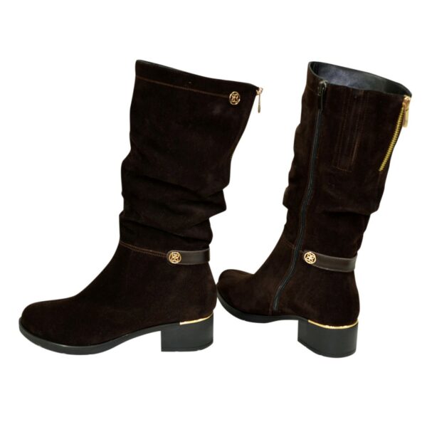 Стильні жіночі чоботи із натуральної замші коричневого кольору, з гумкою у верхній частині чобота. На стійкому підборі. Обсяг гомілки можна замовити від 35 см до 40 см для будь-якого розміру.