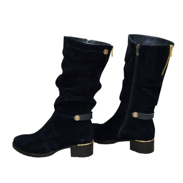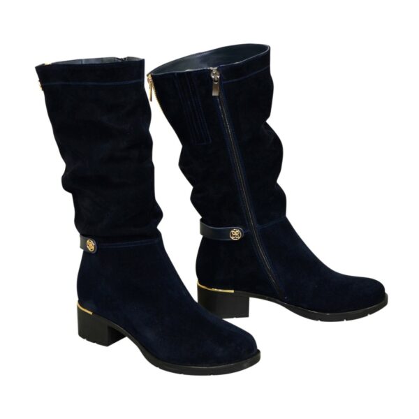 Стильні жіночі чоботи із натуральної замші синього кольору, з гумкою у верхній частині чобота. На потовщеній підошві із стійким підбором. Обсяг гомілки можна замовити від 35 см до 40 см для будь-якого розміру.