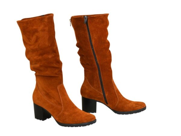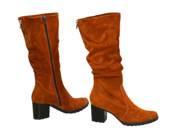 Стильні жіночі чоботи із натуральної замші рудого кольору, з гумкою у верхній частині чобота. На потовщеній підошві. Обсяг гомілки можна замовити від 35 см до 40 см для будь-якого розміру.