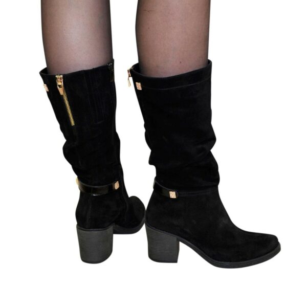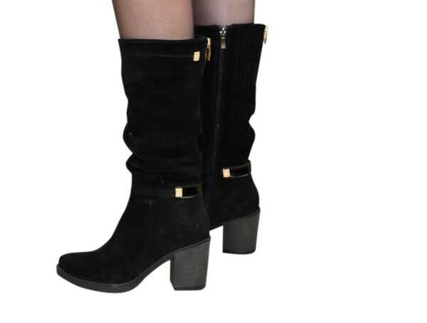 Стильні жіночі чоботи з натуральної замші чорного кольору декоровані лаковим ремінцем та фурнітурою з гумкою у верхній частині чобота. На потовщеній підошві із стійким підбором. Обсяг гомілки можна замовити від 35 см до 40 см для будь-якого розміру.