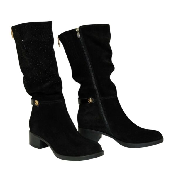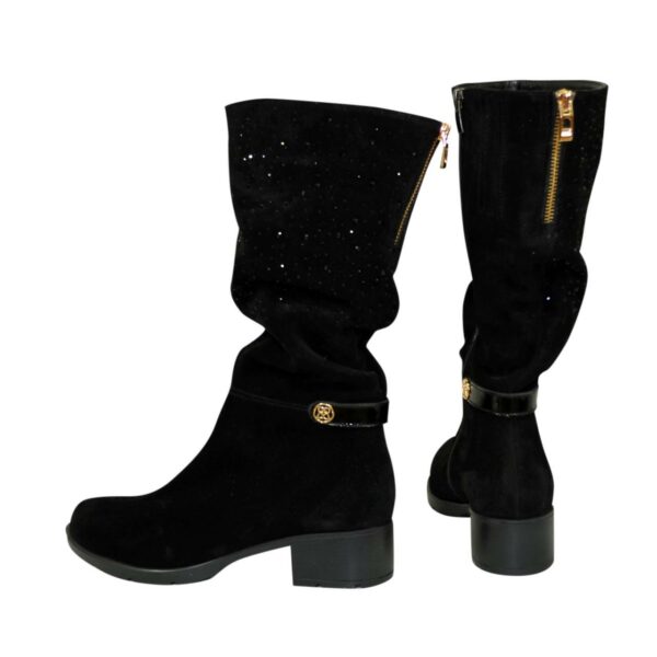Стильні жіночі чоботи з натуральної замші чорного кольору з гумкою у верхній частині чоботи декоровані камінням. На потовщеній підошві та невеликому стійкому підборі. Обсяг гомілки можна замовити від 35 см до 40 см для будь-якого розміру.