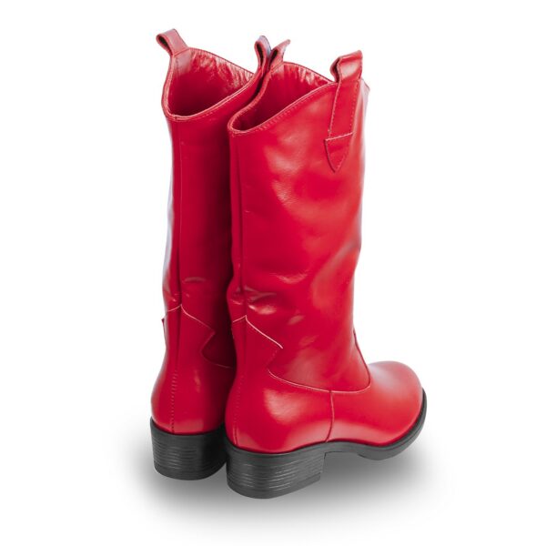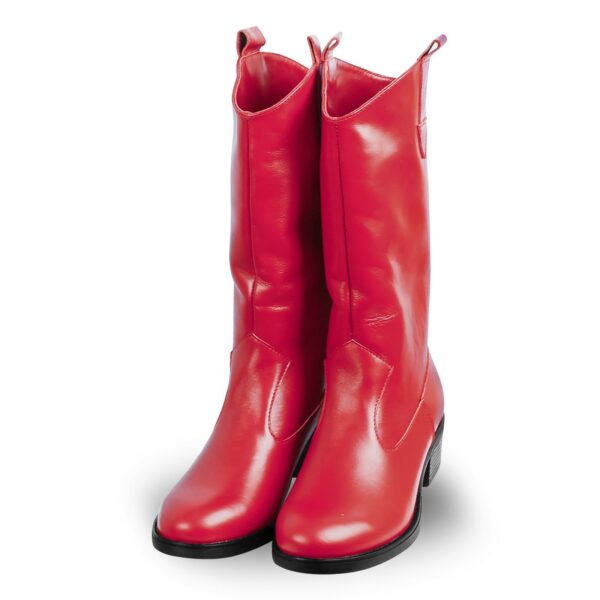 Жіночі стильні чоботи козаки з натуральної шкіри червоного кольору на не високому підборі, прямого взуття.