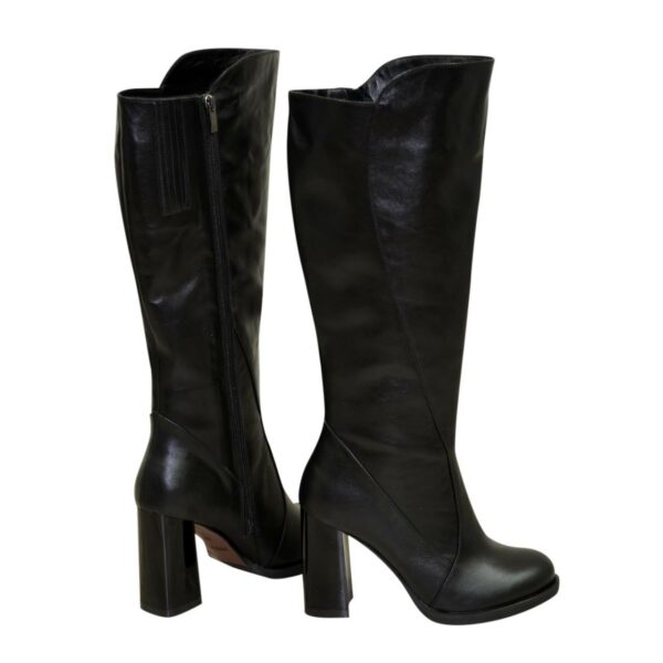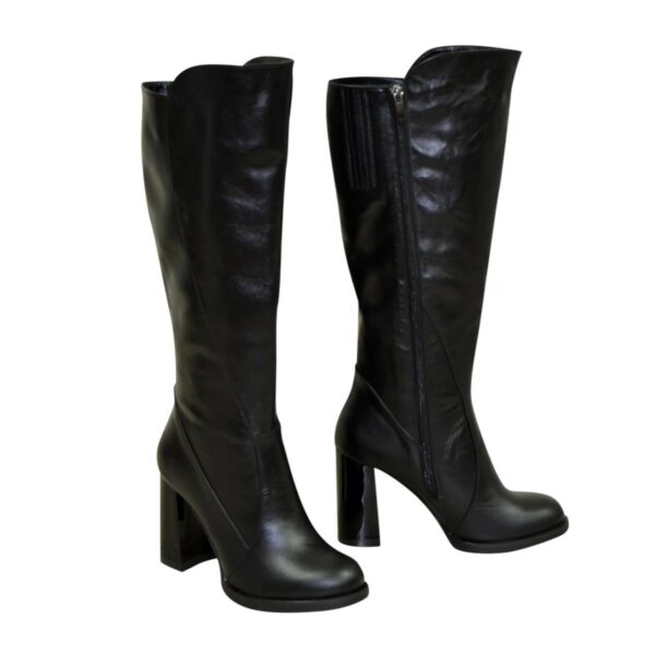 Класичні жіночі чоботи з натуральної шкіри чорного кольору, на халяву є широка вшита гумка збоку чобота для додаткового об'єму гомілки, зручні, практичні і стильні, на високому стійкому підборі. Об'єм гомілки можна замовити для будь-якого розміру.