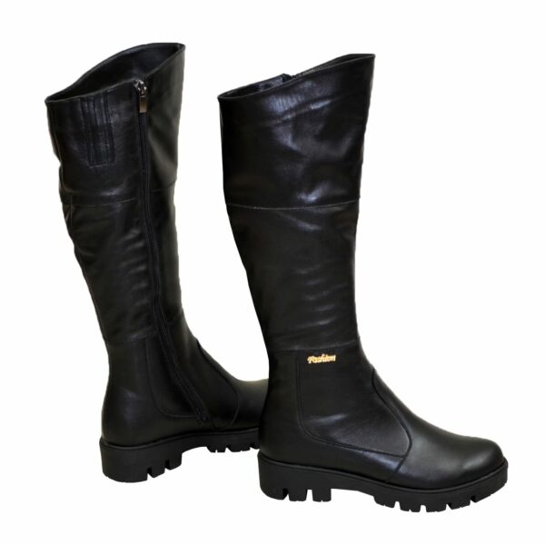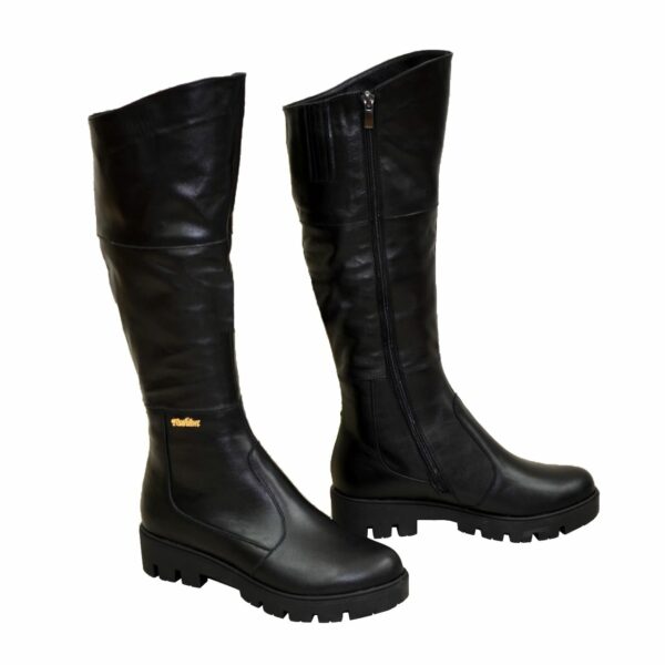 Жіночі чоботи з натуральної шкіри чорного кольору, декоровані фурнітурою, на невисокому підборі, на халяву є широка вшита гумка збоку чобота для додаткового об'єму гомілки. Зручна, висока модна модель. Об'єм гомілки можна замовити для будь-якого розміру.