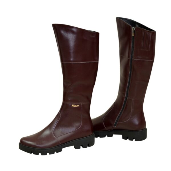 Жіночі чоботи з натуральної шкіри бордового кольору декоровані фурнітурою, на невисокому підборі, на халяву є широка вшита гумка збоку чобота для додаткового об'єму гомілки. Зручна, висока модна модель. Об'єм гомілки можна замовити для будь-якого розміру.