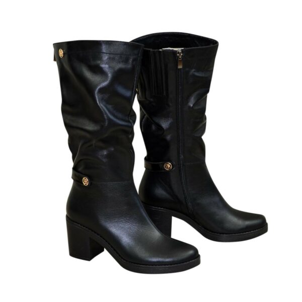Стильні жіночі чоботи із натуральної шкіри чорного кольору, з гумкою у верхній частині чобота. На потовщеній підошві із стійким підбором. Обсяг гомілки можна замовити від 35 см до 40 см для будь-якого розміру.
