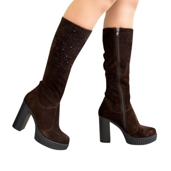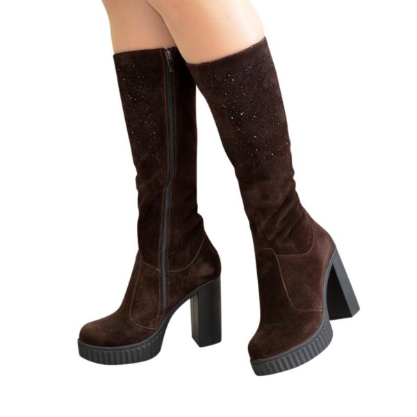 Класичні жіночі чоботи з натуральної замші коричневого кольору, на високих стійких підборах. Декоровані накаткою каміння. Об'єм гомілки можна замовити для будь-якого розміру.