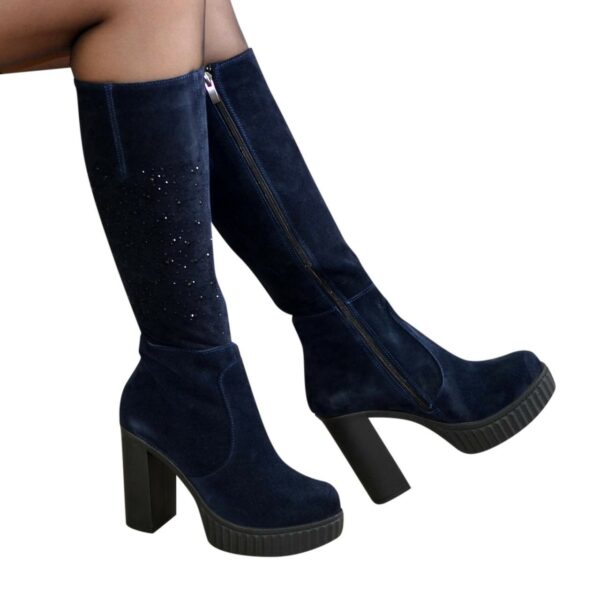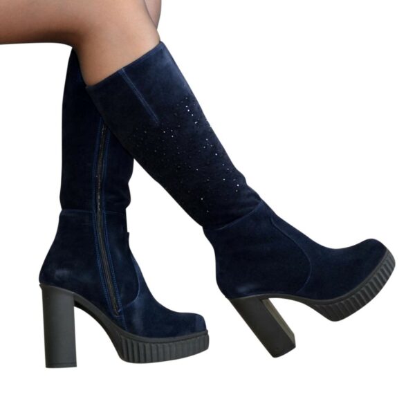 Класичні жіночі чоботи з натуральної замші синього кольору, декоровані накаткою каміння, на халяву є широка вшита гумка збоку чобота для додаткового об'єму гомілки, красиві, зручні та стильні, на високому стійкому підборі. Декоровані фурнітурою. Об'єм гомілки можна замовити для будь-якого розміру.