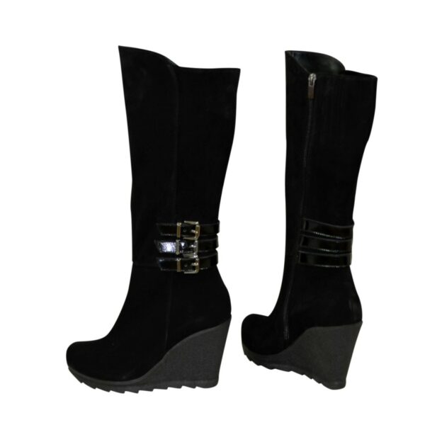 Класичні жіночі чоботи з натуральної замші чорного кольору, декоровані ремінцями з натуральної лакової шкіри чорного кольору на халяву є широка вшита гумка збоку чобота для додаткового об'єму гомілки, зручні, практичні і стильні, на стійкій платформі. Об'єм гомілки можна замовити для будь-якого розміру.