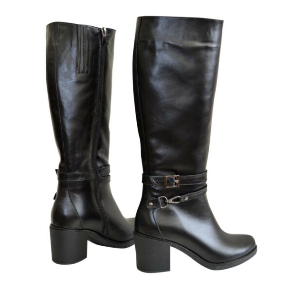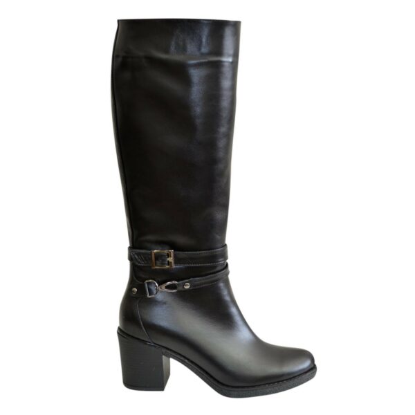 Стильні жіночі чоботи із натуральної шкіри чорного кольору, з гумкою у верхній частині чобота, на потовщеній підошві із стійким підбором.