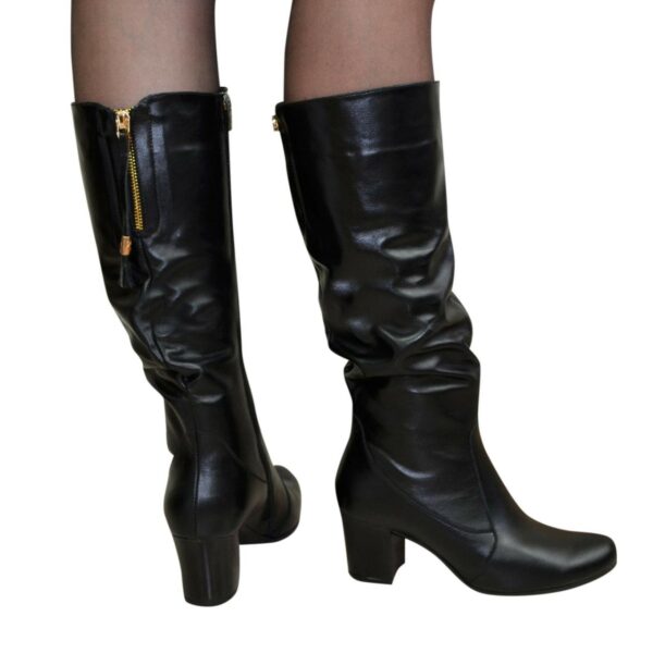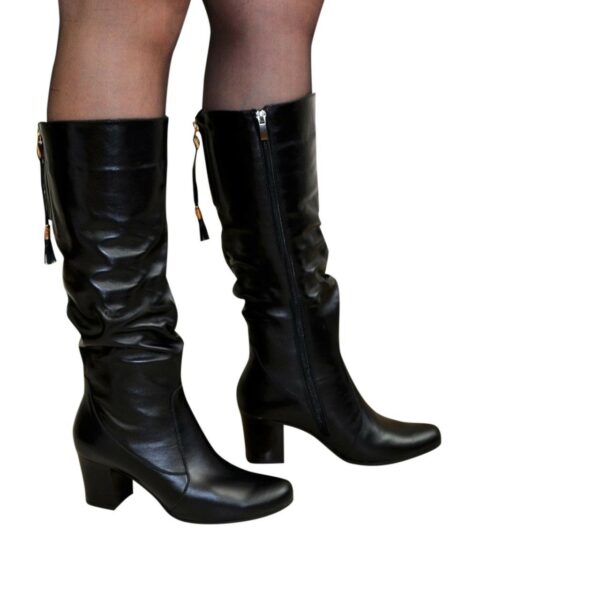Стильні жіночі чоботи із натуральної шкіри чорного кольору, з гумкою у верхній частині чобота. На потовщеній підошві. Обсяг гомілки можна замовити від 35 см до 40 см для будь-якого розміру.