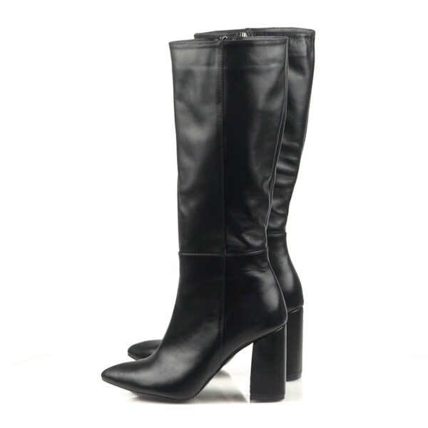 Стильні жіночі чоботи із натуральної шкіри чорного кольору, з гумкою у верхній частині чобота. На високому обтягнутому шкірою підборах. Обсяг гомілки можна замовити від 32 см до 40 см для будь-якого розміру.