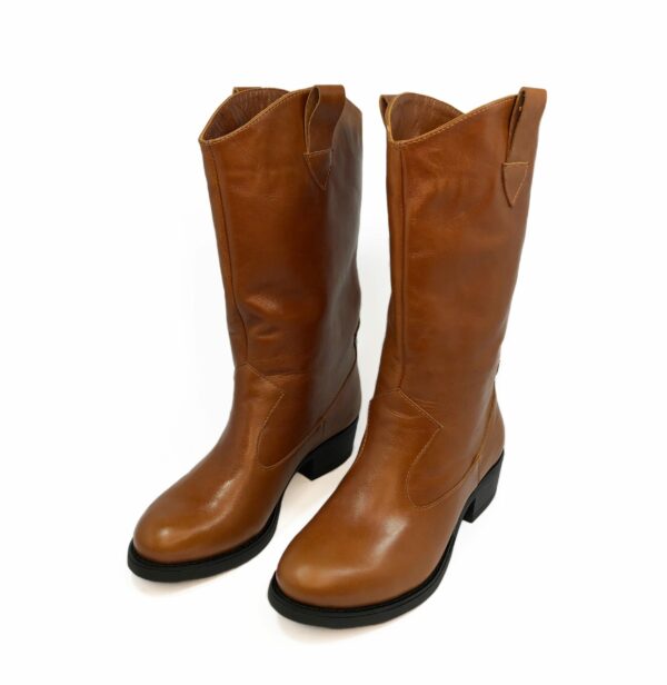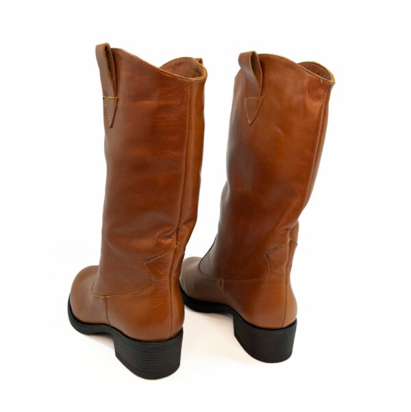 Жіночі чоботи козаки з натуральної шкіри рудого кольору на високому підборі, прямого взуття.