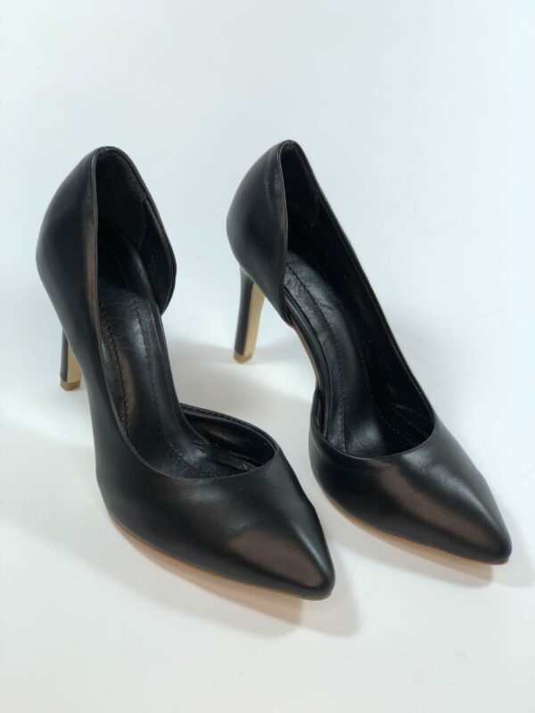 Класичні туфлі із загостреним носком на високій шпильці 9.5 см. обтягнутою шкірою. Виконані із натуральної шкіри чорного кольору. Ручної роботи з використанням виключно натуральних матеріалів високої якості. Відповідають стандартній розмірній сітці. Розраховані на стандартну повноту стегна. Можливий відшив у шкірі, замші різних кольорів.