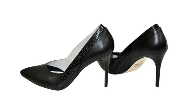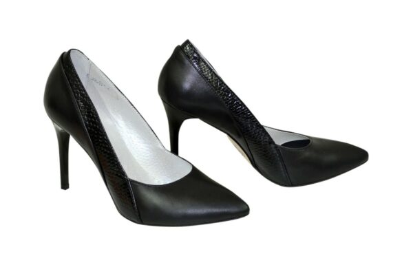 Вихідні класичні туфлі-човники на високій шпильці 9.5 см. Виконані з натуральної шкіри чорного кольору вставка з пітона. Ручної роботи з використанням виключно натуральних матеріалів високої якості. Відповідають стандартній розмірній сітці. Розраховані на стандартну повноту стегна. Можливий відшив у шкірі, замші різних кольорів.
