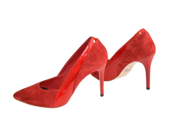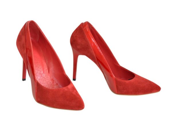 Вихідні класичні червоні туфлі-човники на високій шпильці 9.5 см. Виконані з натуральної замші вставка лак. Ручної роботи з використанням виключно натуральних матеріалів високої якості. Відповідають стандартній розмірній сітці. Розраховані на стандартну повноту стегна. Можливий відшив у шкірі, замші різних кольорів.