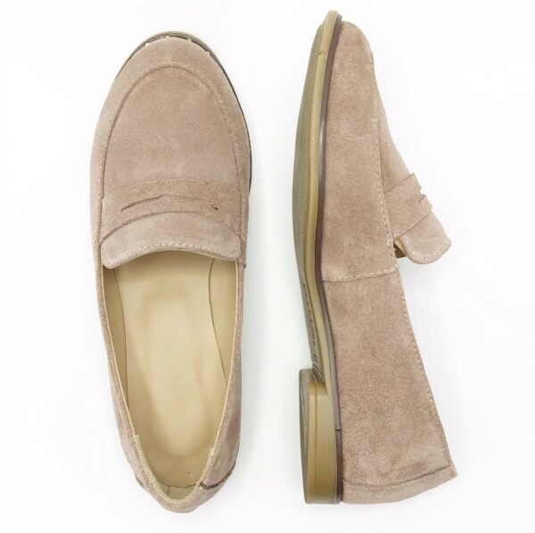 Легкі зручні жіночі класичні мокасини з натуральної замші, колір пудра, на полегшеній підошві з міні каблучком. Виготовляються виключно із натуральних матеріалів. Повномірні відповідають стандартній сітці розміру. Можливий відшив у шкірі та замші різних кольорів ― враховуємо будь-які побажання замовника