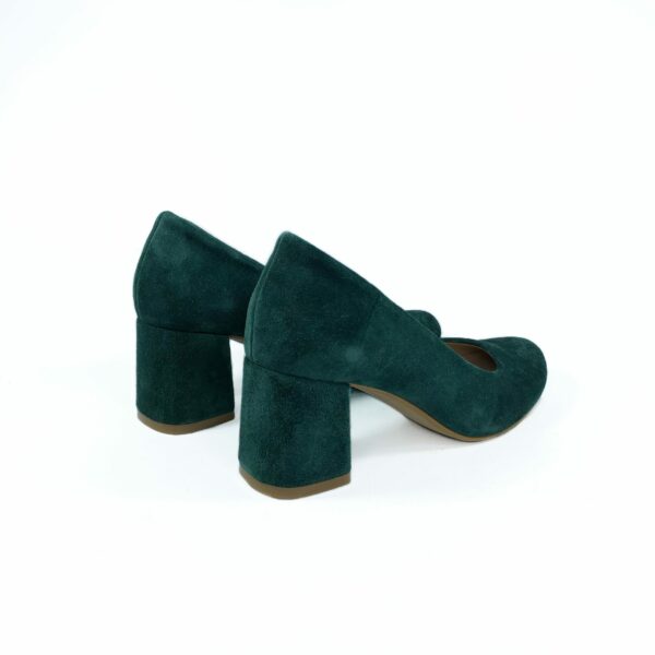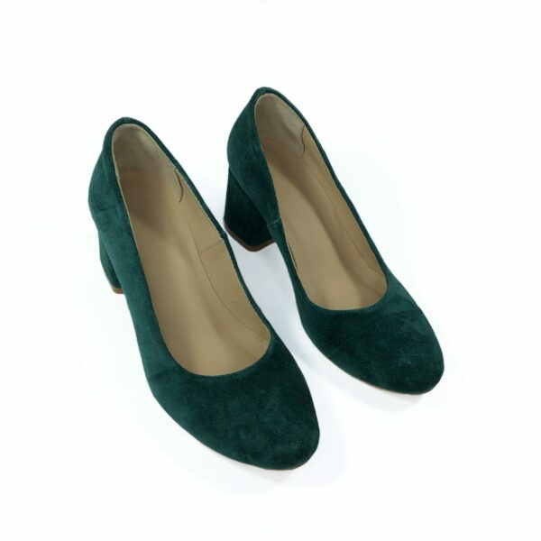 Човники-туфлі класичні жіночі із натуральної замші зеленого кольору на стійкому підборі висотою 6.5 см. Ручної роботи з використанням виключно натуральних матеріалів високої якості. Повномірні, відповідають стандартній сітці розміру. Можливий відшив у шкірі, замші різних кольорів.