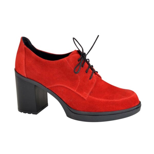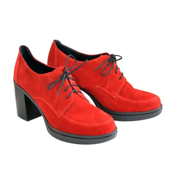 Закриті жіночі туфлі з натуральної шкіри та замші червоного кольору, на широкому стійкому підборі висота 7.5 см. спереду 1.5 см. Завдяки шнурівці підійдуть на великий підйом. Ручної роботи з використанням виключно натуральних матеріалів високої якості. Повномірні, відповідають стандартній сітці розміру. Розраховані на стандартну повноту стегна. Можливий відшив у шкірі, замші різних кольорів.