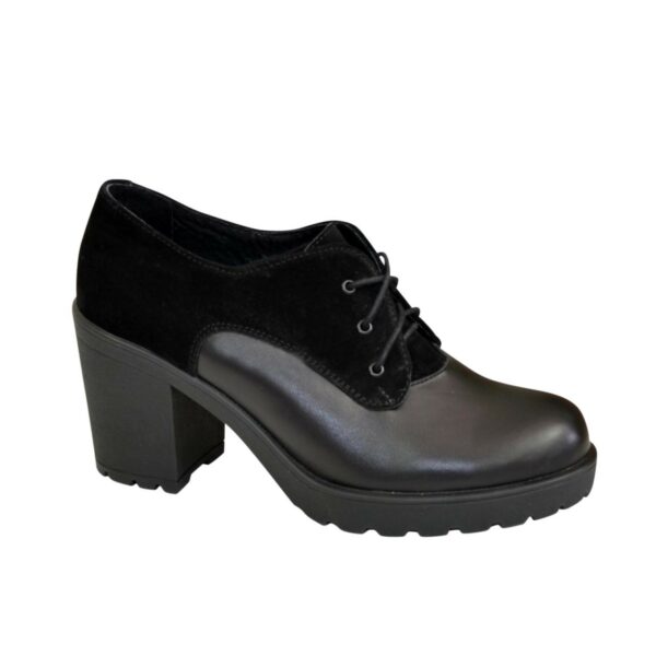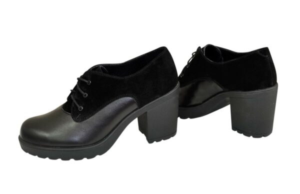 Закриті жіночі туфлі з натуральної шкіри та замші чорного кольору, на широкому стійкому підборі висота 7.5 см. спереду 1.5 см. Завдяки шнурівці підійдуть на великий підйом. Ручної роботи з використанням виключно натуральних матеріалів високої якості. Повномірні, відповідають стандартній сітці розміру. Розраховані на стандартну повноту стегна. Можливий відшив у шкірі, замші різних кольорів.