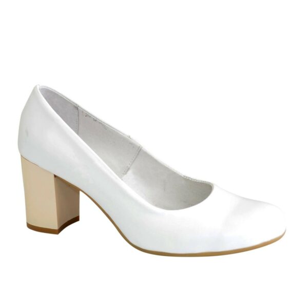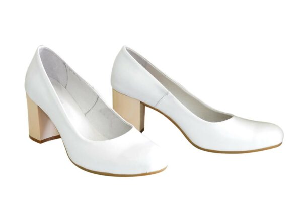 Човники-туфлі класичні жіночі з натуральної білої шкіри на стійких підборах висотою 6 см. Ручної роботи з використанням виключно натуральних матеріалів високої якості. Повномірні, відповідають стандартній сітці розміру. Можливий відшив у шкірі, замші різних кольорів.