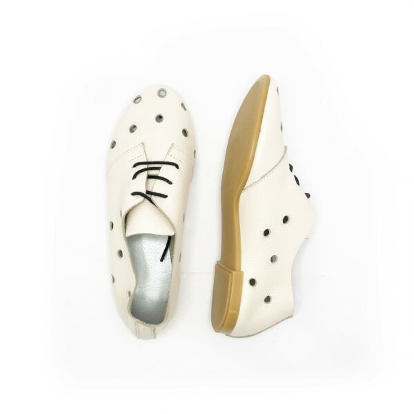 Жіночі туфлі з натуральної шкіри бежевого кольору без підкладки, на полегшеній підошві. Дуже легкі та практичні, завдяки шнурівці регулюється підйом. Виготовляються виключно із натуральних матеріалів. Повномірні відповідають стандартній сітці розміру. Можливий відшив у шкірі та замші різних кольорів ― враховуємо будь-які побажання замовника