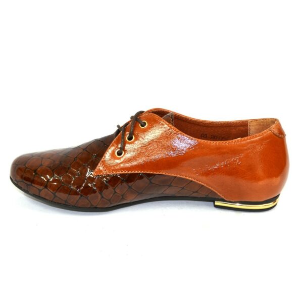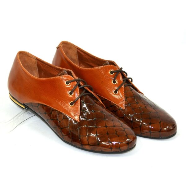 Повсякденні м'які жіночі туфлі, низький хід на міні каблучці, комбіновані з рудої шкіри та коричневого крокодила. Завдяки шнурівці підійдуть на ніжку з підйомом. Ручної роботи з використанням виключно натуральних матеріалів високої якості. Повномірні, відповідають стандартній сітці розміру. Розраховані на стандартну повноту стегна. Можливий відшив у шкірі, замші різних кольорів.