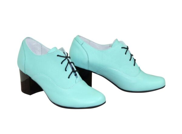 Туфлі класичні жіночі з натуральної м'ятної шкіри, на стійкому підборі висотою 6 см. Ручної роботи з використанням виключно натуральних матеріалів високої якості. Повномірні завдяки шнурівці підходять на великий діапазон ніг. Відповідають стандартній розмірній сітці. Можливий відшив у шкірі, замші різних кольорів.