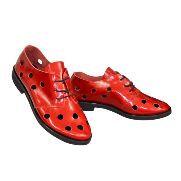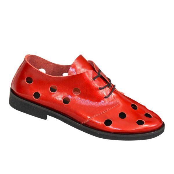 Літні м'які жіночі туфлі, низький хід на міні каблучці з натуральної червоної лакової шкіри. Без підкладки, полегшені. Завдяки шнурівці підійдуть на ніжку з підйомом. Ручної роботи з використанням виключно натуральних матеріалів високої якості. Повномірні, відповідають стандартній сітці розміру. Розраховані на стандартну повноту стегна. Можливий відшив у шкірі, замші різних кольорів.