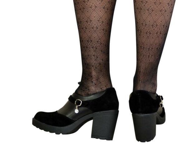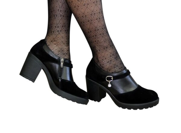 Закриті жіночі туфлі з натуральної шкіри та замші чорного кольору, на не високому стійкому підборі в висота 7.5 см, попереду 1.5 см . На блискавці. Ручної роботи з використанням виключно натуральних матеріалів високої якості. Повномірні, відповідають стандартній сітці розміру. Розраховані на стандартну повноту стегна. Можливий відшив у шкірі, замші різних кольорів.