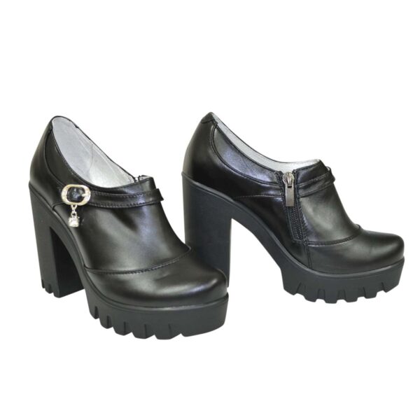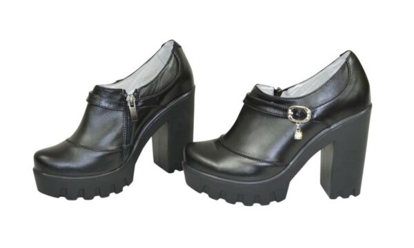 Закриті жіночі туфлі з натуральної шкіри чорного кольору, на високому стійкому підборі висотою 10,5 см, попереду 2,5 см . На блискавці. Ручної роботи з використанням виключно натуральних матеріалів високої якості. Повномірні, відповідають стандартній сітці розміру. Розраховані на стандартну повноту стегна. Можливий відшив у шкірі, замші різних кольорів.