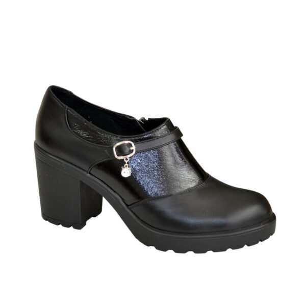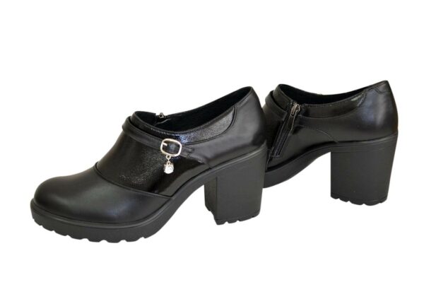 Закриті жіночі туфлі з натуральної лакової шкіри та шкіри чорного кольору, на не високому стійкому підборі в висота 7,5 см, попереду 1,5 см . На блискавці. Ручної роботи з використанням виключно натуральних матеріалів високої якості. Повномірні, відповідають стандартній сітці розміру. Розраховані на стандартну повноту стегна. Можливий відшив у шкірі, замші різних кольорів.