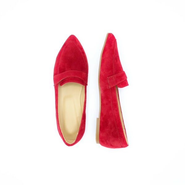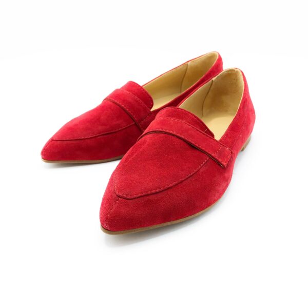 Зручні, легкі туфельки-лофери з натуральної замші червоного кольору з гострим носком. Можливий відшив у шкірі, замші різних кольорів.