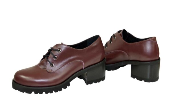 Закриті жіночі туфлі з натуральної шкіри бордового кольору, на стійкому не високому підборі висотою 5 см. спереду 1.5 см. Завдяки шнурівці підійдуть на великий підйом. Ручної роботи з використанням виключно натуральних матеріалів високої якості. Повномірні, відповідають стандартній сітці розміру. Розраховані на стандартну повноту стегна. Можливий відшив у шкірі, замші різних кольорів.