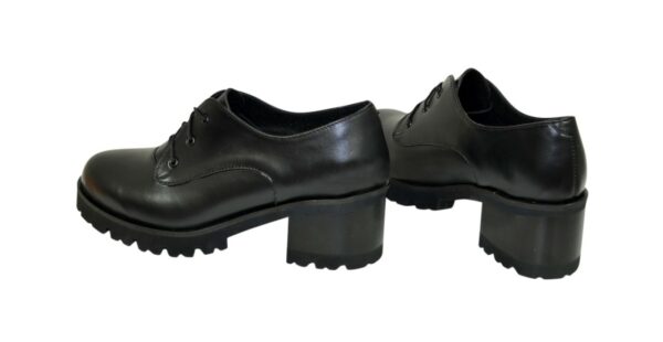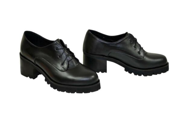 Закриті жіночі туфлі з натуральної шкіри чорного кольору, на широкому стійкому підборі висотою 5 см. спереду 1.5 см. Завдяки шнурівці підійдуть великий підйом. Ручної роботи з використанням виключно натуральних матеріалів високої якості. Повномірні, відповідають стандартній сітці розміру. Розраховані на стандартну повноту стегна. Можливий відшив у шкірі, замші різних кольорів.