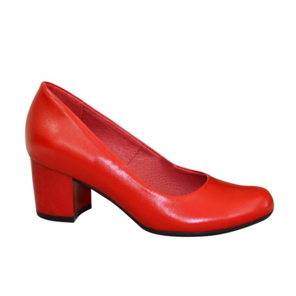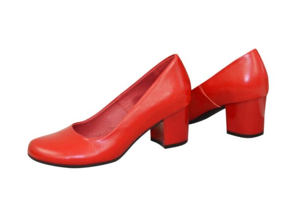 Човники-туфлі класичні жіночі з натуральної червоної шкіри на стійкому підборі висотою 6 см. Ручної роботи з використанням виключно натуральних матеріалів високої якості. Повномірні, відповідають стандартній сітці розміру. Можливий відшив у шкірі, замші різних кольорів.