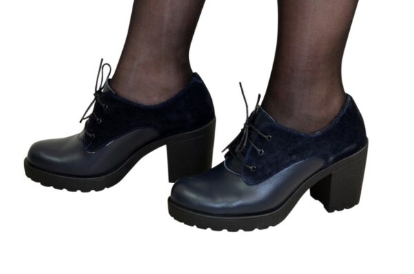 Закриті жіночі туфлі з натуральної шкіри та замші синього кольору, на широкому стійкому підборі висота 7.5 см. спереду 1.5 см. Завдяки шнурівці підійдуть на великий підйом. Ручної роботи з використанням виключно натуральних матеріалів високої якості. Повномірні, відповідають стандартній сітці розміру. Розраховані на стандартну повноту стегна. Можливий відшив у шкірі, замші різних кольорів.