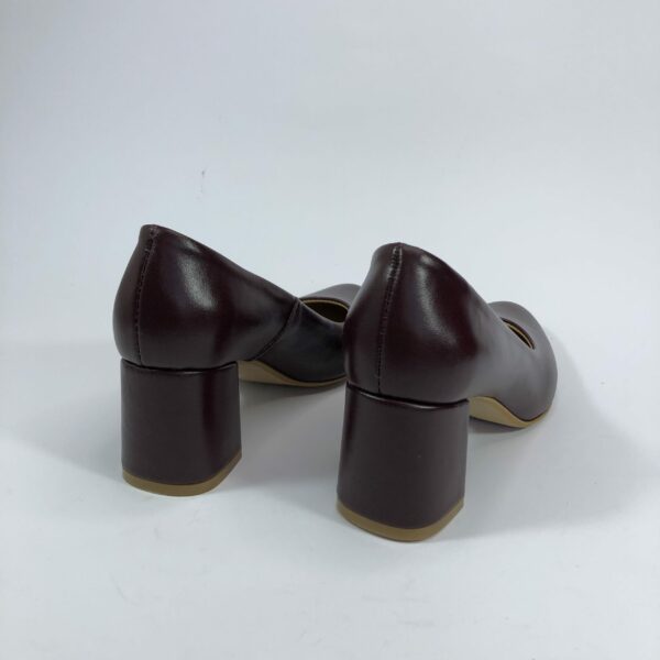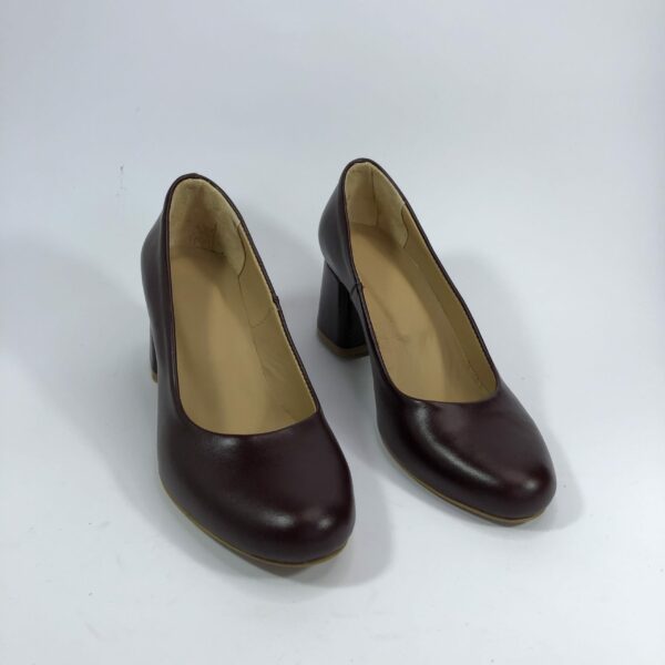 Човники-туфлі класичні жіночі із натуральної шкіри бордового кольору, на стійкому обтяжному підборі висотою 6.5 см. Ручної роботи з використанням виключно натуральних матеріалів високої якості. Повномірні, відповідають стандартній сітці розміру. Можливий відшив у шкірі, замші різних кольорів.
