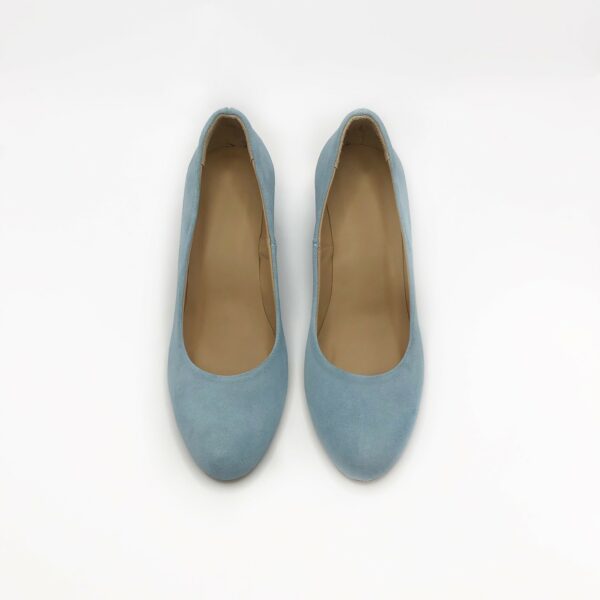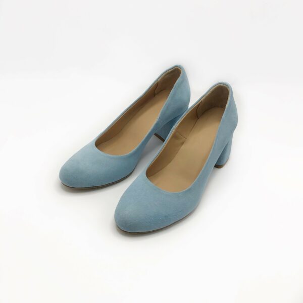 Човники-туфлі класичні жіночі з натуральної замші ніжно-блакитного кольору, на стійкому підборі висотою 6.5 см. Ручної роботи з використанням виключно натуральних матеріалів високої якості. Повномірні, відповідають стандартній сітці розміру. Можливий відшив у шкірі, замші різних кольорів.