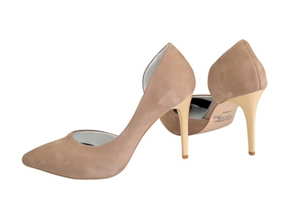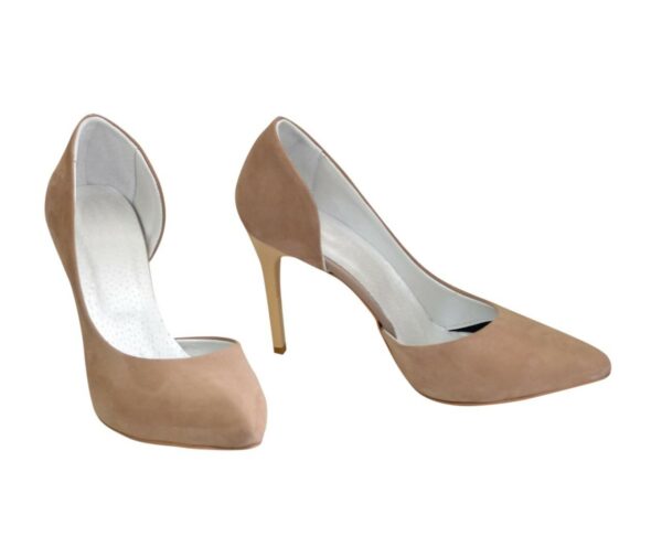 Класичні туфлі із загостреним носком на високій шпильці 9.5 см. Виконані з натуральної шкіри нубук бежевого кольору. Ручної роботи з використанням виключно натуральних матеріалів високої якості. Відповідають стандартній розмірній сітці. Розраховані на стандартну повноту стегна. Можливий відшив у шкірі, замші різних кольорів.